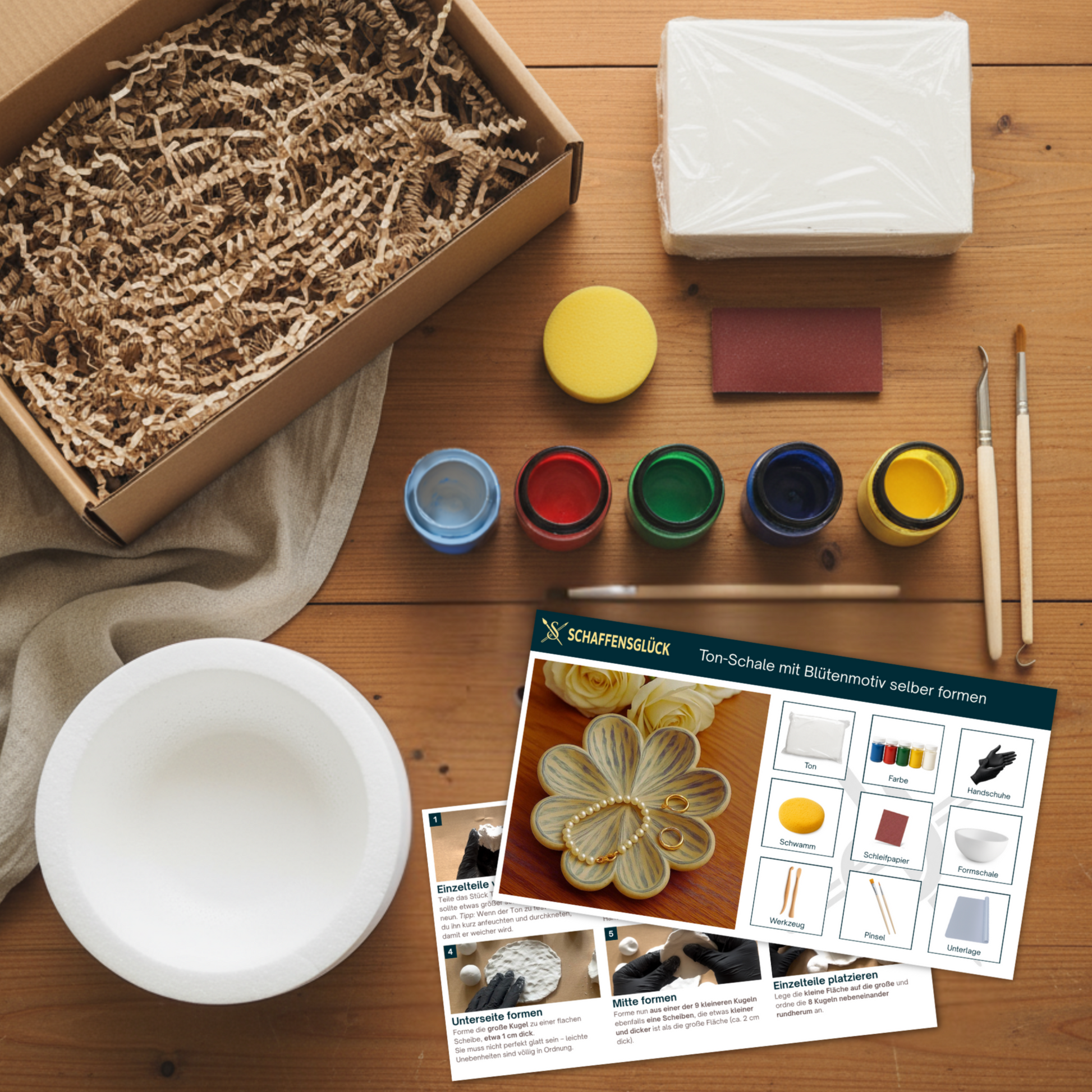 Dieses Kreativpaket enthält alles, was du brauchst, um eine elegante Schmuckschale aus lufttrocknender Modelliermasse selbst zu formen.